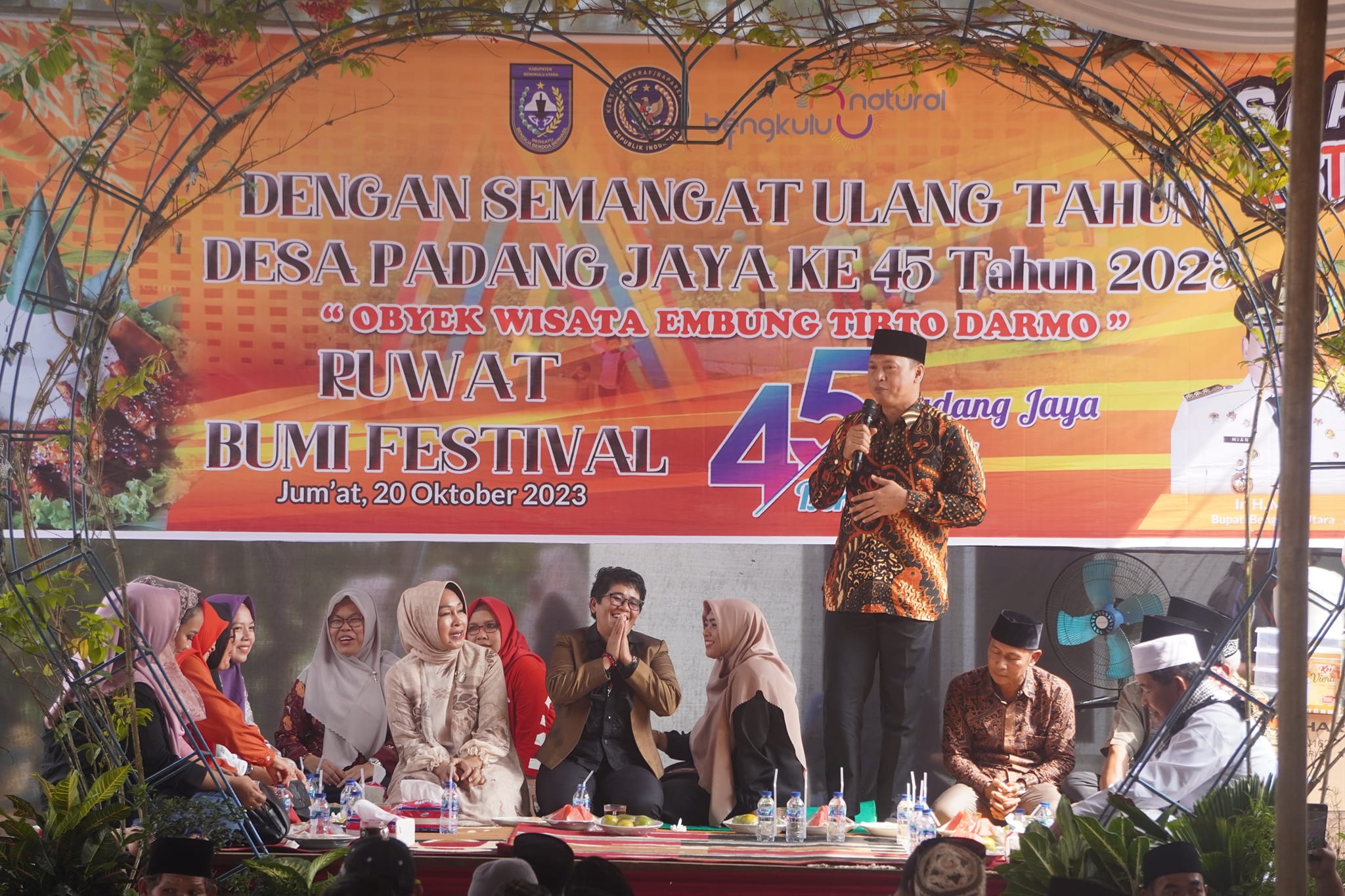 Bengkulu Utara, fahrinews.com – Ketua DPRD Kabupaten Bengkulu Utara, Bersama Pemerinta Kabupaten Bengkulu Utara, dalam hal ini Sekretaris Daerah Bengkulu Utara, H. Fitriyansyah, S.STP, M.M, bersama Ketua Tim Penggerak PKK, Ny. Hj. Eko Kurnia Ningsih, menghadiri acara ruwat festival bumi dalam rangka peringatan hari ulang tahun desa Padang Jaya ke – 45 tahun 2023, di Embung Tirto Darmo desa Padang Jaya, Jumat (20/10/2023).